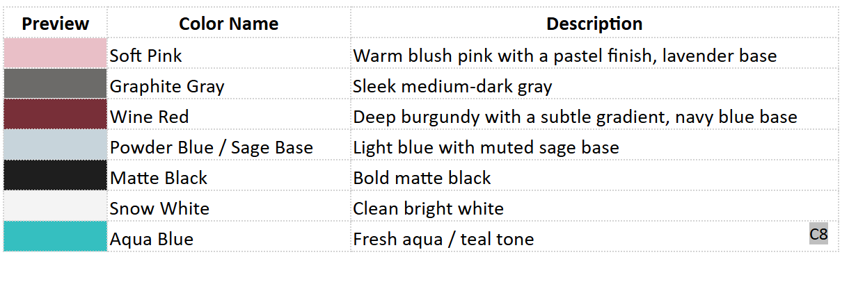 Aqua Blue, Graphite Grey, Matte Black, Powder Blue / Sage Base, Snow White, Soft Pink, Wine Red